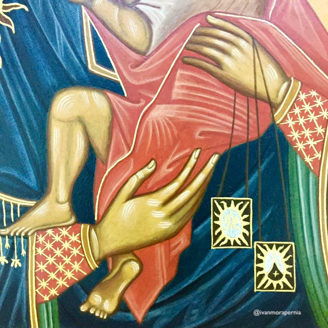 Lluvia dulce y fecunda de nubes de promesa transfigurando savias y trigos de sequía, mantén entre tus manos nuestra esperanza ilesa y enjuga nuestro llanto, Vid en flor, OH María.